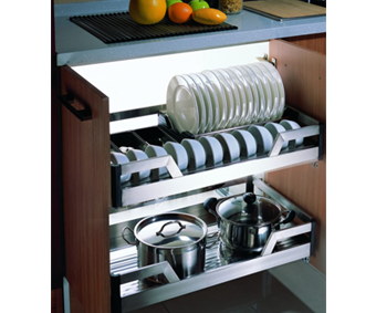 Giá để bát đĩa tủ dưới có thiết kế inox dạng hộp, có ray âm giảm chấn, trên cùng một sản phẩm có thể lắp đặt được cả cánh mở và cánh kéo rất tiện dụng. Với hai kích thước khác nhau dành riêng cho mỗi loại tủ bếp cũng giúp người nội trợ có thêm nhiều sự lựa chọn. Khu vực để bát, đĩa, nồi xoong được thiết kế riêng biệt rất thuận tiện khi sắp xếp và sử dụng. Hệ thống inox dạng hộp chắc chắn, sang trọng, ray âm giảm chấn nâng cao tuổi thọ của sản phẩm, giúp người nội trợ chỉ cần một thao đơn giản, nhẹ nhàng là có thể lấy đồ vật dụng nhanh chóng, hiệu quả mà không cần phải dùng nhiều sức lực. Với thiết kế này, người nội trợ cũng dễ dàng vệ sinh lau chùi giá bát hàng ngày. Độ bền và sáng bóng của inox cao cấp chắc chắn sẽ giữ cho phòng bếp một vẻ đẹp sang trọng lâu dài.